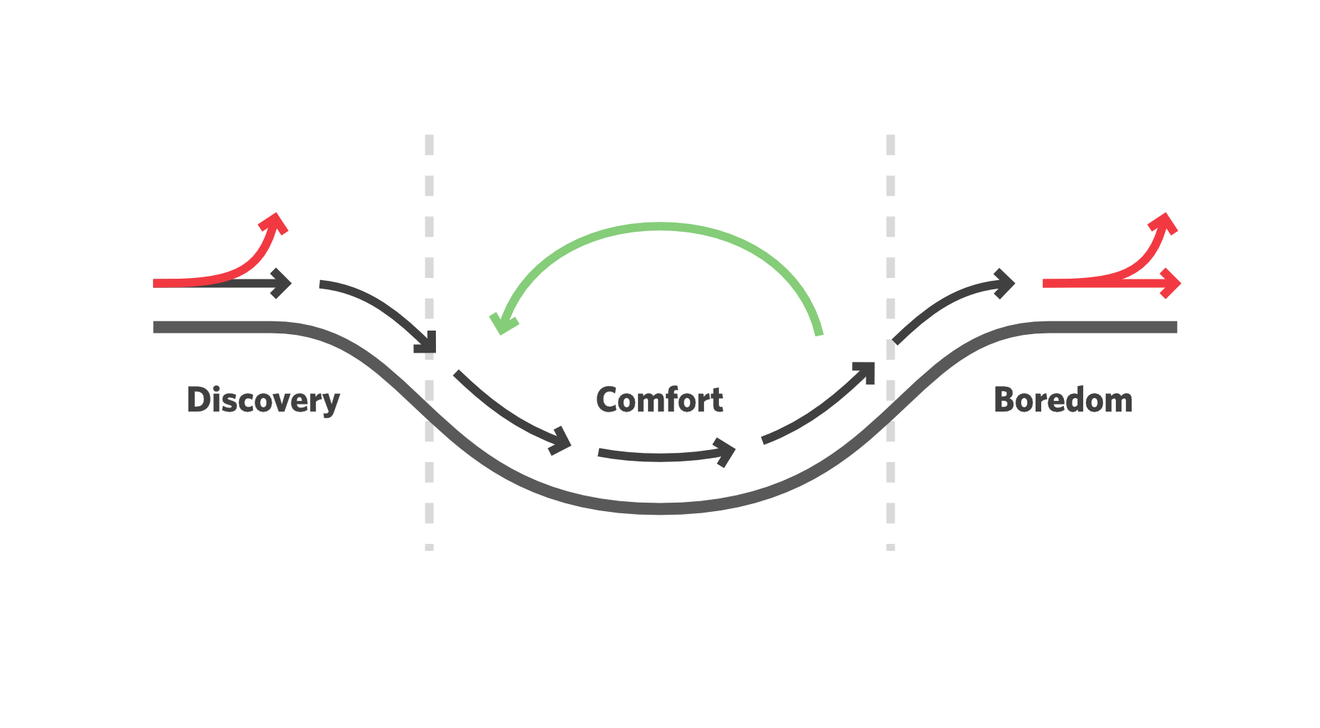 가장 효과적인 형태의 UX(대부분의 메트릭을 만족시키는 것을 의미함)는 사용자를 발견에서 편안함으로 빠르게 이동시킨 다음 사용자를 계속해서 발견으로 되돌아가지 않고 편안함 단계의 시작으로 되돌릴 수 있도록 합니다. 이것은 간단한 기능 조정에서 스타일 수정에 이르기까지 수많은 미세 발견, 새로운 경험의 작은 덩어리를 통해 달성할 수 있습니다.