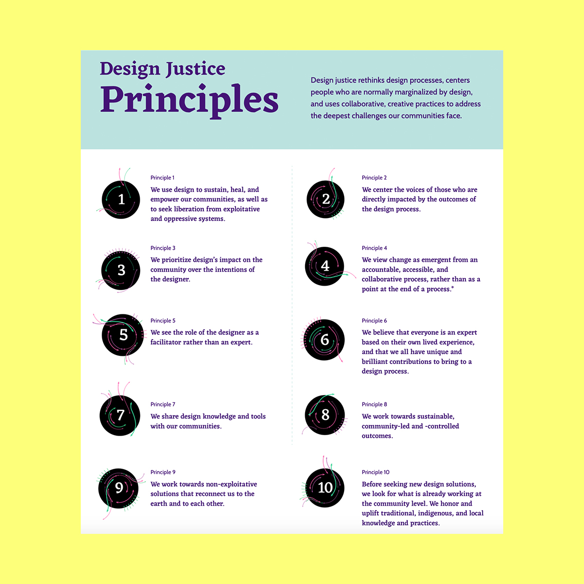 이 작품은 Design Justice Network 운영 위원회(Una Lee, Sasha Costanza-Chock, Wesley Taylor, Victoria Barnett, Denise Shanté Brown)가 공동 저술했습니다.