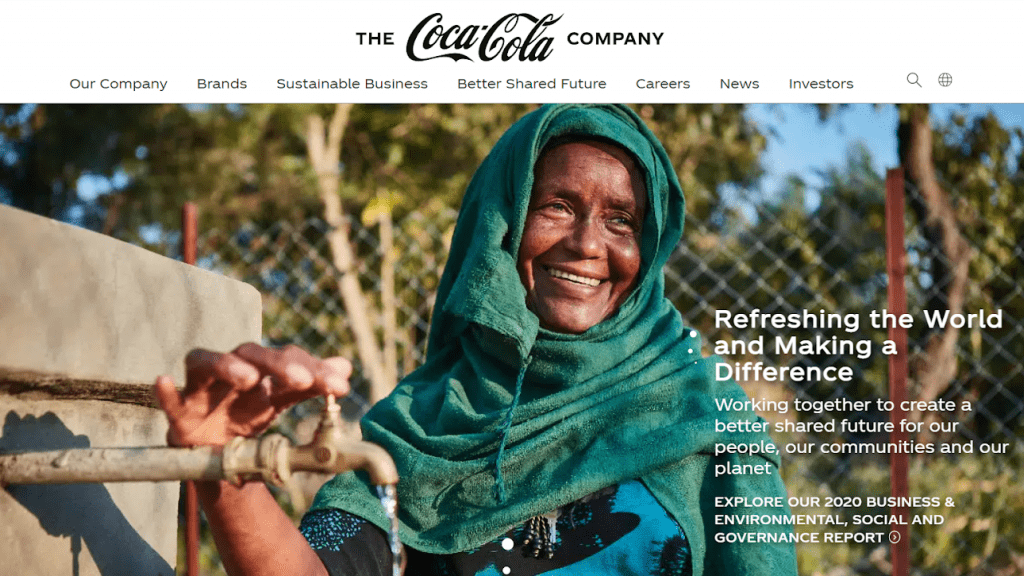 청량음료 회사인 코카콜라의 웹 사이트도 훌륭한 디자인을 선보입니다. 모든 콘텐츠는 회사의 주요 목표와 활동을 알려주는 이미지를 기반으로 합니다. 사이트 상단에는 세계적으로 유명한 로고와 고유한 글꼴이 있어 경쟁사와 차별화되어 브랜드 인지도를 높일 수 있습니다.