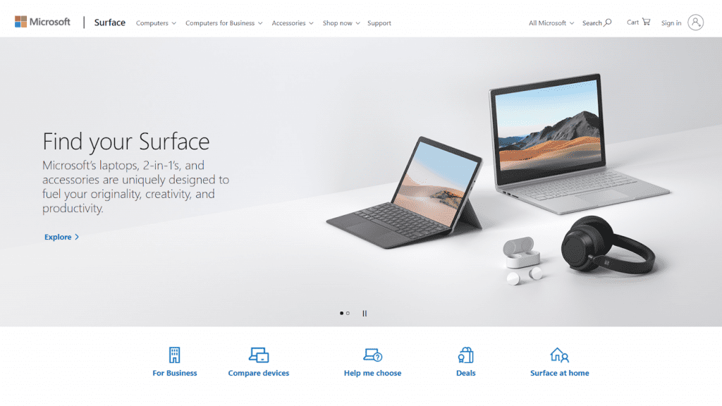 Microsoft는 기술 분야에서 잘 알려진 회사입니다. 사이트는 브랜드를 완벽하게 표현하고 훌륭한 시각적 인상을 남깁니다. 많은 제품 사진과 간단한 설명으로 가득 차 있으며 브랜드 제품을 소개하는 멋진 동영상 콘텐츠가 있습니다. 사이트의 구조와 요소의 배열이 로고와 유사하다는 점은 주목할 가치가 있습니다.