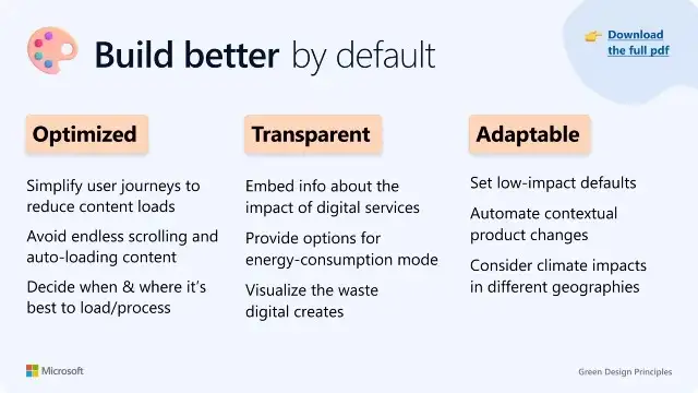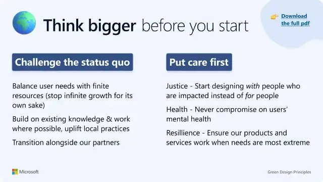 Microsoft는 대담한 기후 목표 를 가지고 있으며 Microsoft Design도 디지털 디자인을 보다 지속 가능하도록 재개념화 합니다. 우리의 최근 그린 디자인 원칙 은 기후 위기의 복잡성에 대한 디자인을 위해 우리의 창의성을 사용하는 제품 제조업체를 지원하기 위한 광범위한 노력의 시작을 표시합니다.