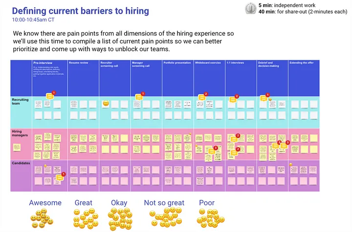 우선순위를 공유하려면 각 팀이 각자의 관점을 공유하여 함께 일하는 모든 사람과 더 잘 공감하고 이해할 수 있도록 하는 것이 중요하다는 것을 알았습니다. 나는 그것을 위한 공간을 만들고 우리 모두를 같은 페이지에 놓기 위해 여행 지도 워크샵을 사용했습니다. 참석자들이 내가 이미 알고 있는 것을 흡수하기 시작하고 우리가 더 잘 협력할 수 있도록 관점을 바꾸는 것을 보는 것이 즐거웠습니다. 이 공유된 비전을 함께 구축함으로써 채용 프로세스를 간소화하는 동시에 최선의 경로에 맞출 수 있는 곳을 식별할 수 있었기 때문에 빠르게 앞으로 나아갈 수 있었습니다.