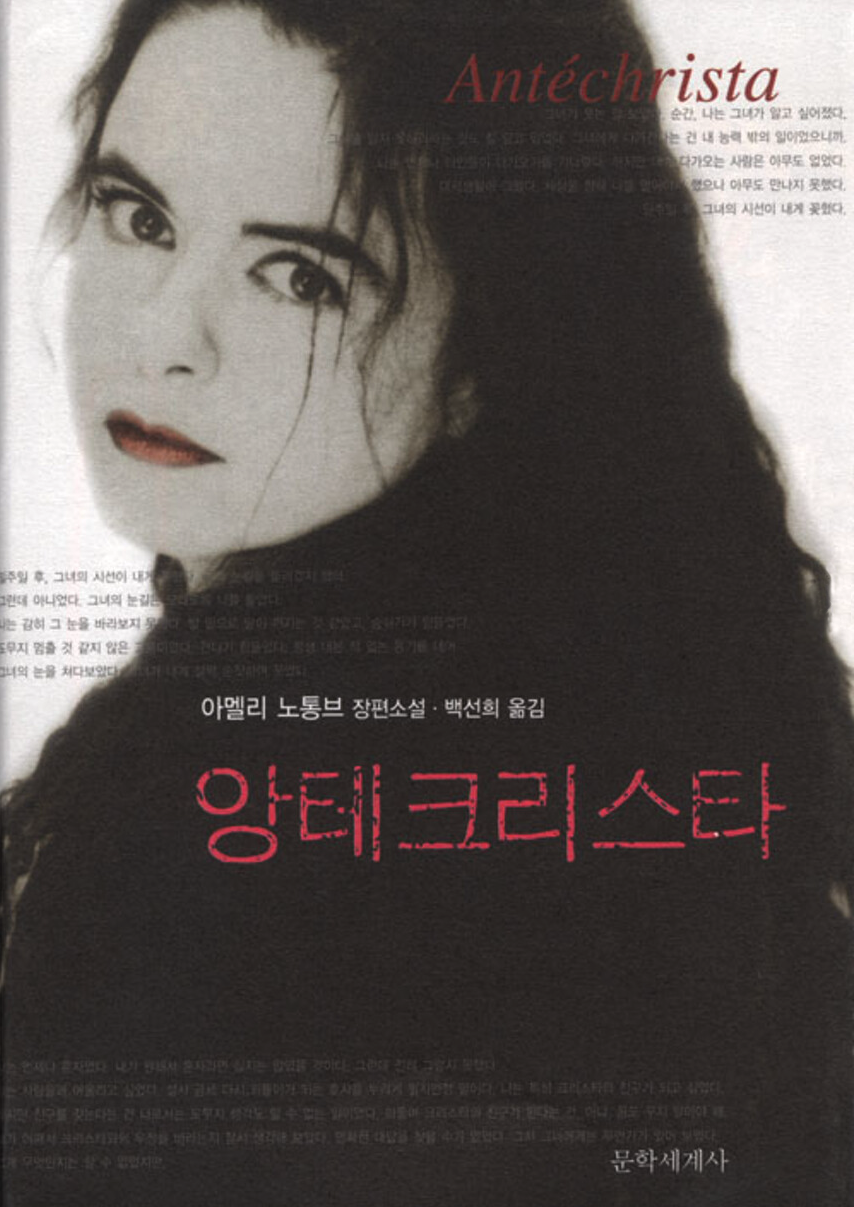 ‘앙테크리스타’는 아멜리 노통브의 12번째 소설이고, 출간 당시 “글을 왜 쓰는가?” 라는 기자의 질문에 작가는 간단명료하게 답한다. ‘’할 줄 아는 게 그거밖에 없다”라고 했고, 그리고 “글쓰기가 나를 삶에 끌어들였고, 내 삶의 모든 칸을 채우고 있다.”로 했다. 개인적으로 생각할 때 천성이 글쟁이가 아닐까 생각된다. 때문인지 개인적으로 아멜리 노통브의 소설을 꾸준하게 읽게 되는 것이 아닌가 생각할 정도로 자주 찾아 읽는 편이다. 물론 이제 4번째 읽는 소설이기에 아멜리 노통브 소설을 읽을 수밖에 없을 것 같다.
