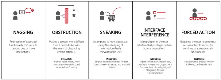 일반적인 유형의 어두운 패턴 목록은 Deceptive Design 웹사이트에 이미 정리되어 있지만, 이 목록은 5가지 기본 범주로 그룹화할 수도 있습니다.
