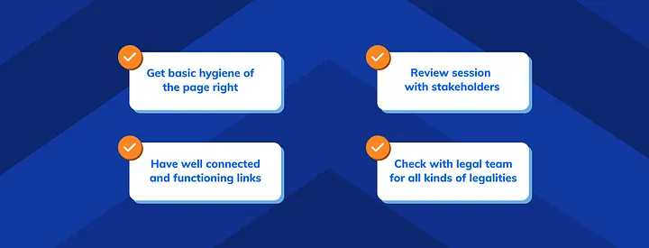 • 목록에 없는 모든 항목 확인 : 단계적 롤아웃 계획을 세웁니다. 페이지 로드 시간, 적법성 준수, 작동하는 링크 등과 같은 기본 위생 상태를 올바르게 유지해야 합니다. 마지막으로 모든 기대치를 충족할 수 있도록 이해 관계자와 마지막 검토 세션을 설정합니다.