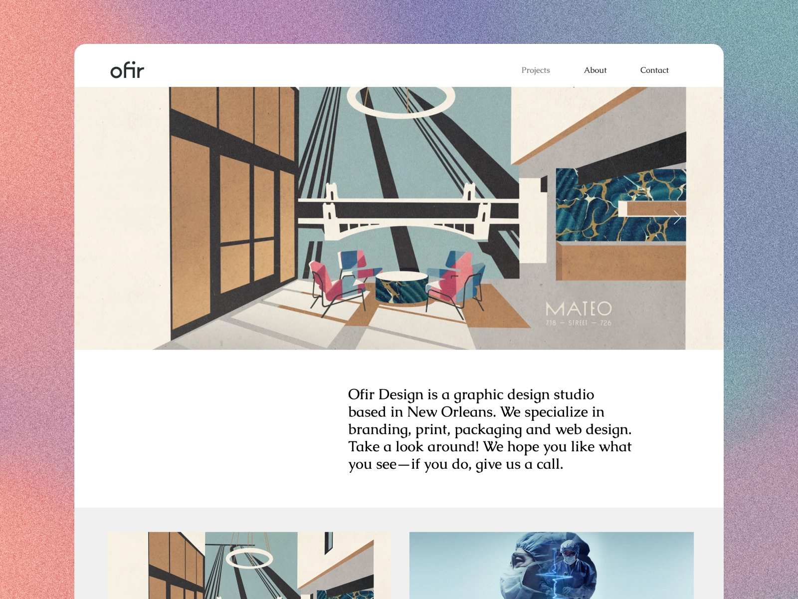고객은 Ofir Design에 끌린 것 같습니다. New Orleans Museum of Art에서 디자인을 도운 예술가의 전시회부터 활기찬 New Orleans 예술 현장과의 관련성에 이르기까지 Ofir는 매우 창의적인 놀이터에서 가장 멋진 아이들 중 하나입니다. 그의 주변 환경에 영향을 받는 것은 도시가 "내 작업에 더 많은 색상을 도입하는 것"과 함께 그가 강조하는 점입니다. 그러나 Ofir에게는 브랜드 뒤에 있는 사람들을 이해하는 것이 성공적인 프로젝트의 핵심이며 그가 자신의 길을 개척하는 방법 중 하나입니다.