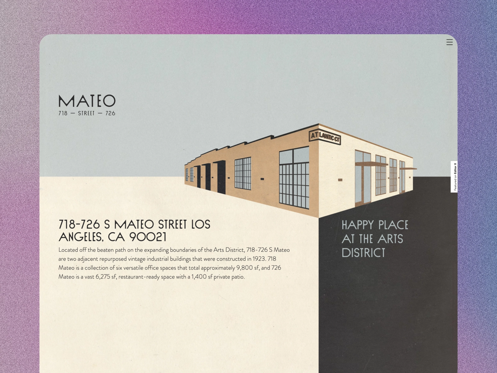 “Dre 박사와 Kendrick Lemar가 Compton에서 자란 건물이나 Kansas City의 경찰서와 같이 항상 뭔가 다르기 때문에 브리핑을 좋아합니다. 매번 다른 세상으로 나를 데려갑니다. 저는 인테리어 디자이너와 함께 연구하고 작업하므로 좋은 협업입니다. 우리는 그래픽 요소와 이들이 어떻게 함께 작동할지 작업합니다. 건물이 생기기도 전에 스케치만으로 Mateo 웹사이트를 만들었지 만 그들이 원하는 느낌을 알고 그래픽 언어를 생각해 낼 수 있었습니다.”